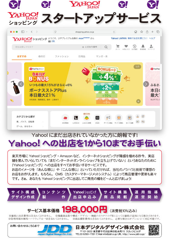 楽天市場にYahoo!ショッピング・Amazonなど、インターネットショッピングが隆盛を極める昨今、実店舗を営んでいらしていても「まだインターネットオンラインショップを立ち上げていない」というあなたのために『楽天市場』や『Yahoo!ショッピング』への出店をすべてお手伝いするサービスです。